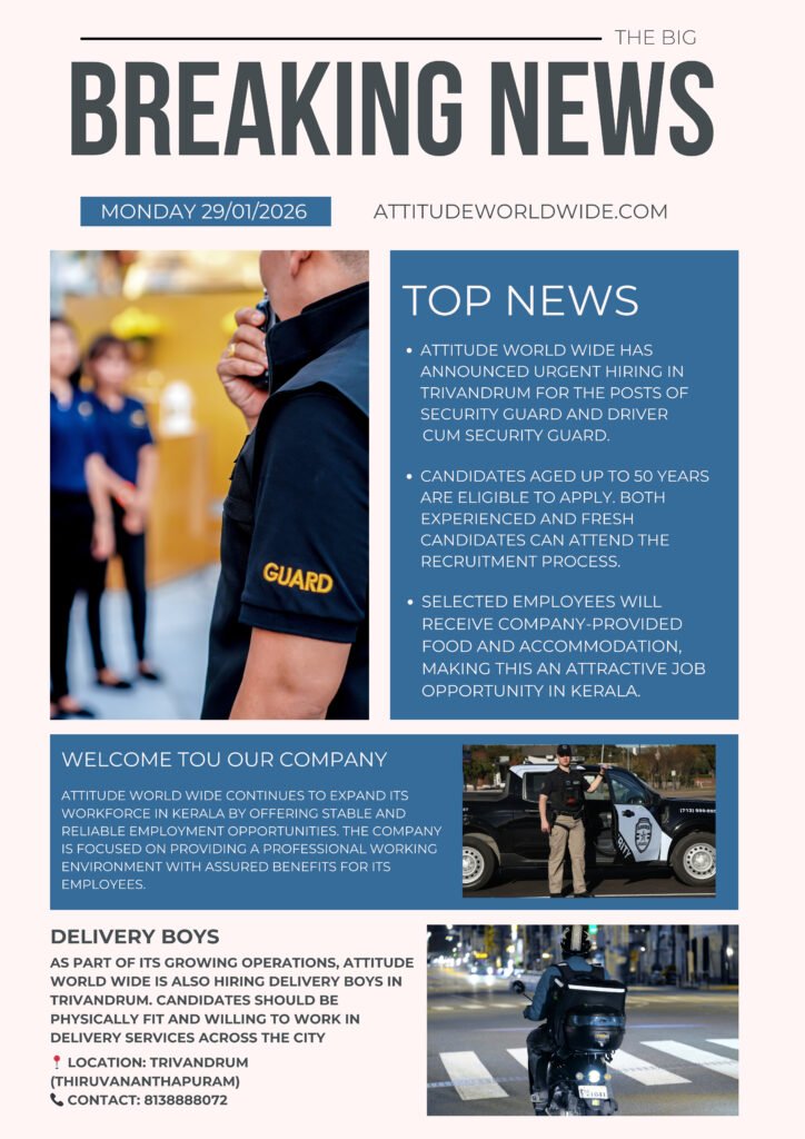 Trivandrum: Attitude World Wide has announced an urgent recruitment drive in Trivandrum for the posts of Security Guard and Driver-Cum-Security Guard. The company is inviting applications from eligible candidates to fill immediate vacancies across different locations in the city.